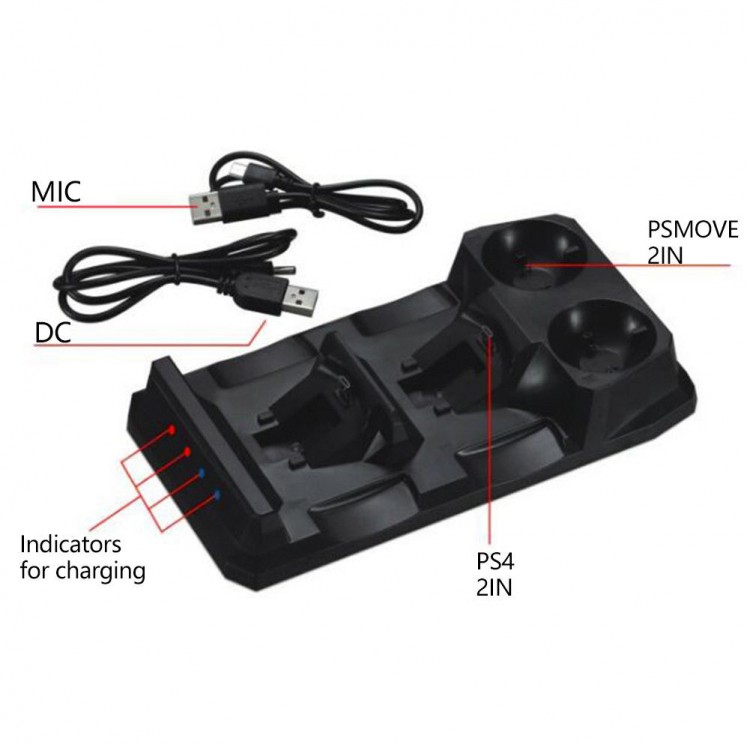 این استند 4 کاره به شما اجازه میدهد تا به صورت همزمان دو عدد کنترلر DualShock 4 و دو عدد کنترلر Move را شارژ کنید. این استند با کابل USB به منبع برق که میتواند آداپتور USB یا پلی استیشن 4 شما باشد متصل میشود و همچنین، دارای کابل AC جداگانه است. این استند شارژ دارای چهار نشانگر LED است که وضعیت شارژ را به شما اطلاع میدهند و کنترلرهای DualShock 4 را با استفاده از پورت miniUSB شارژ میکند.
