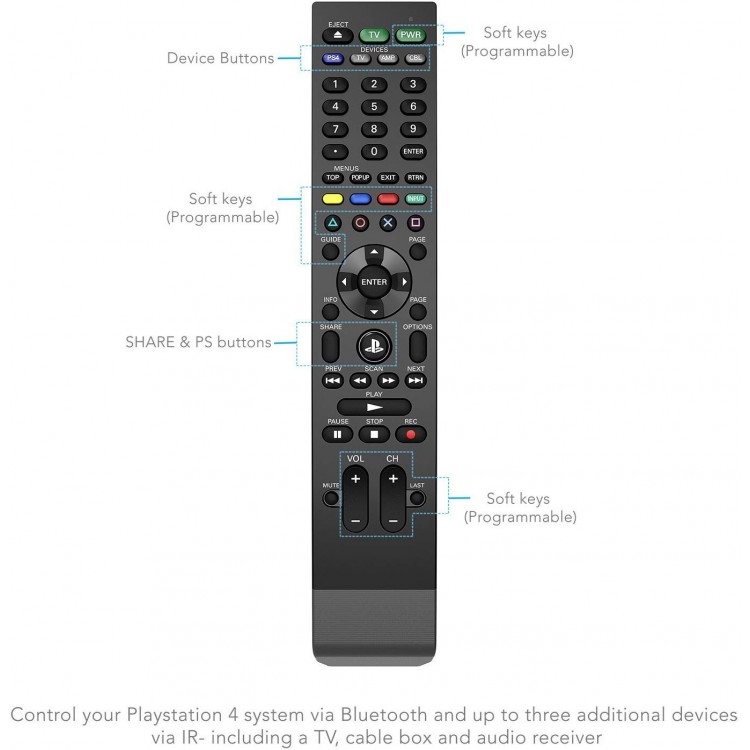 علاوه بر دکمه‌های معمول یک ریموت کنترل، این دستگاه دارای تمام دکمه‌های دوال شاک 4 و همچنین 11 دکمه قابل برنامه‌ریزی بیشتر است.