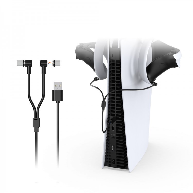 کابل شارژ Dobe به طول ۸۰ سانتیمتر، دارای یک اینترفیس USB و دو شاخه اینترفیس USB-C با اتصال مغناطیسی است تا بتوانید دو عدد کنترلر PS VR2 را به صورت همزمان شارژ کنید. با این کابل شما میتوانید دو کنترلر را به کنسول یا پریز برق وصل کنید. اینترفیس USB-C این کابل به صورت مغناطیسی وصل شده و به راحتی قابل جداسازی است. این کابل با دوال سنس نیز سازگار است.