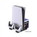 استند چندکاره Dobe مخصوص پلی استیشن 5 به شما این امکان را میدهد تا کنسول پلی استیشن 5 را به صورت عمودی قرار دهید، دو عدد کنترلر دوال سنس را به صورت همزمان شارژ کنید و ۱۱ قاب دیسکهای پلی استیشن 5 را نگهداری کنید.