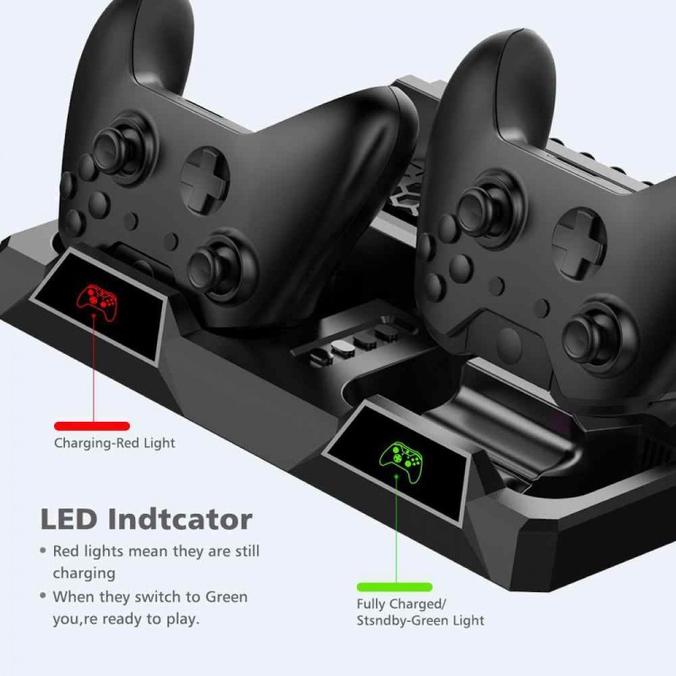این استند دارای دو محل شارژ کنترلر ایکس باکس وان است که با کنترلرهای الیت نیز سازگار هستند. روی این استند، شش عدد متصل کننده USB قرار دارد که به شما این امکان را میدهند تا کنترلر خود را روی این استند قرار دهید. این دو شارژر دارای نشانگر LED برای نمایش وضعیت شارژ هستند که میزان شارژ را با دو رنگ سبز و قرمز نمایش میدهد. برق این شارژر نیز از کنسول ایکس باکس وان یا منبع برق خارجی تأمین میشود. این استند یک پورت USB نیز دارد تا وسایل جانبی خود را با اتصال به آن، به کنسول ایکس باکس وان خود متصل کنید.
