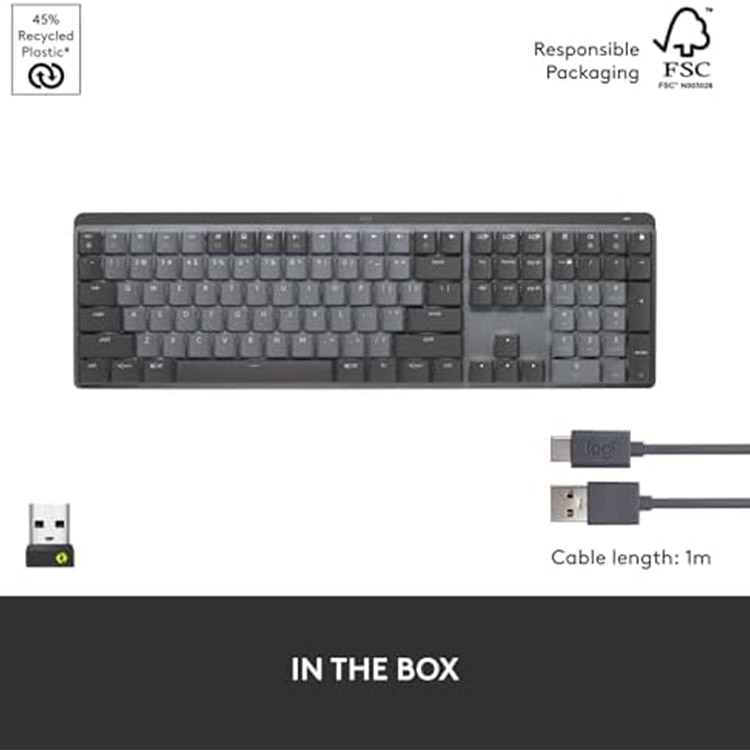 کیبورد MX Mechanical با تکنولوژی Logi Bolt بلوتوث یا اتصال بیسیم، برد بیسیم تا 10 متر را ارائه میدهد و با یک بار شارژ USB-C، تا 15 روز یا تا 10 ماه با خاموش بودن نورپردازی پشتی، دوام میآورد. این کیبورد با برنامههای سفارشیسازی پشتیبانی شده توسط Logi Options+ در ویندوز و macOS سازگار است و با موسهای دارای تکنولوژی Logitech Flow نیز کار میکند.