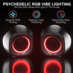 طراحی مدرن و جذاب این بلندگوها با نورپردازی RGB محیطی سایکدلیک در پشت دستگاه، جلوهای مرموز و گیمینگ به محیط شما میبخشد. سه حالت نورپردازی قابل انتخاب برای فضاهای مختلف وجود دارد و همچنین امکان خاموش کردن نور نیز فراهم است. طراحی کمحجم و مینیمالیستی با قاب محکم، ظاهری آرام و کمکلید به بلندگوها میدهد. طول کابل تا 37 اینچ بین دو واحد صوتی، سازگاری با اکثر دستگاههای رومیزی را امکانپذیر میسازد.