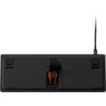 این کیبورد با استفاده از یک کابل USB-C به کامپیوتر شما وصل میشود و دارای پایههایی کوچک برای تنظیم ارتفاع است.